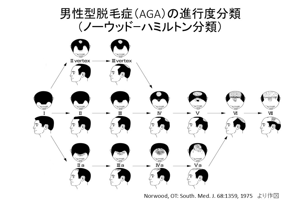 男性の薄毛の多くを占める男性型脱毛症(AGA)は思春期以降に生え際(M字部分など)から頭頂部(つむじ)にかけて頭髪が細くなり薄毛が進行していくのが特徴です。(下図参照)AGAはすでに原因が解明されていて、明確に改善する治療薬が開発されて20年以上が経っています。早期から治療を開始すればほとんどの男性はAGAによる薄毛は進行せずに済むと考えられています。
